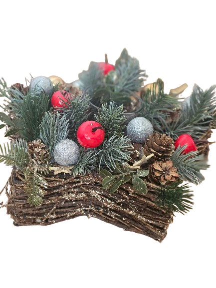Descoperă magia Crăciunului cu acest aranjament handmade, in formă de stea elegantă, care va adăuga un strop de căldură și farmec în fiecare colțișor al casei tale.