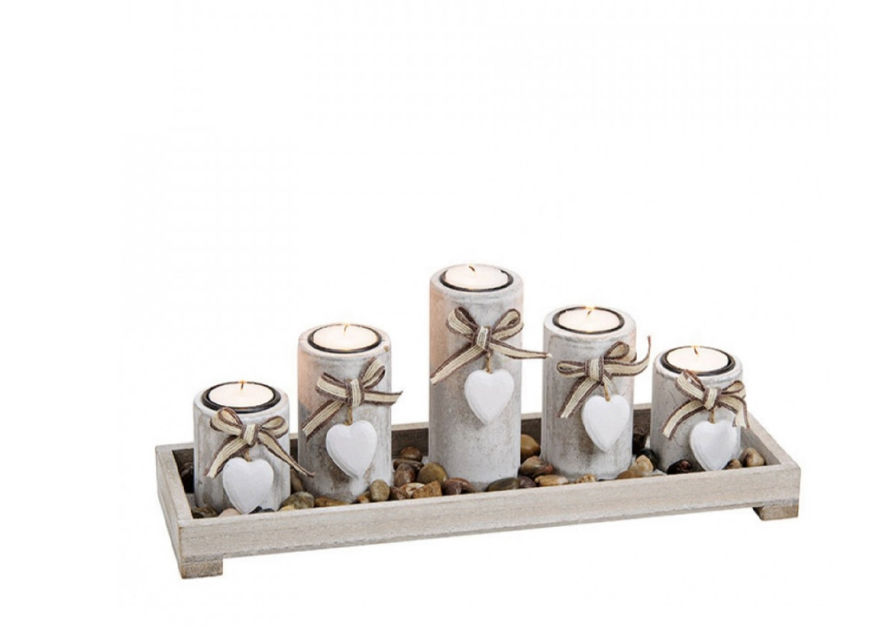 Suport pentru lumanari, format din 5 piese, suport din lemn, pietre naturale, decoratiuni in forma de inima.